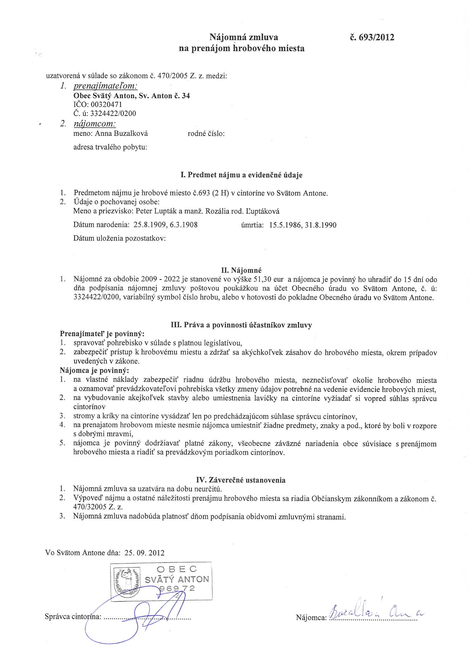 693/2012, Anna Buzalková, Prenájom hrobového miesta |