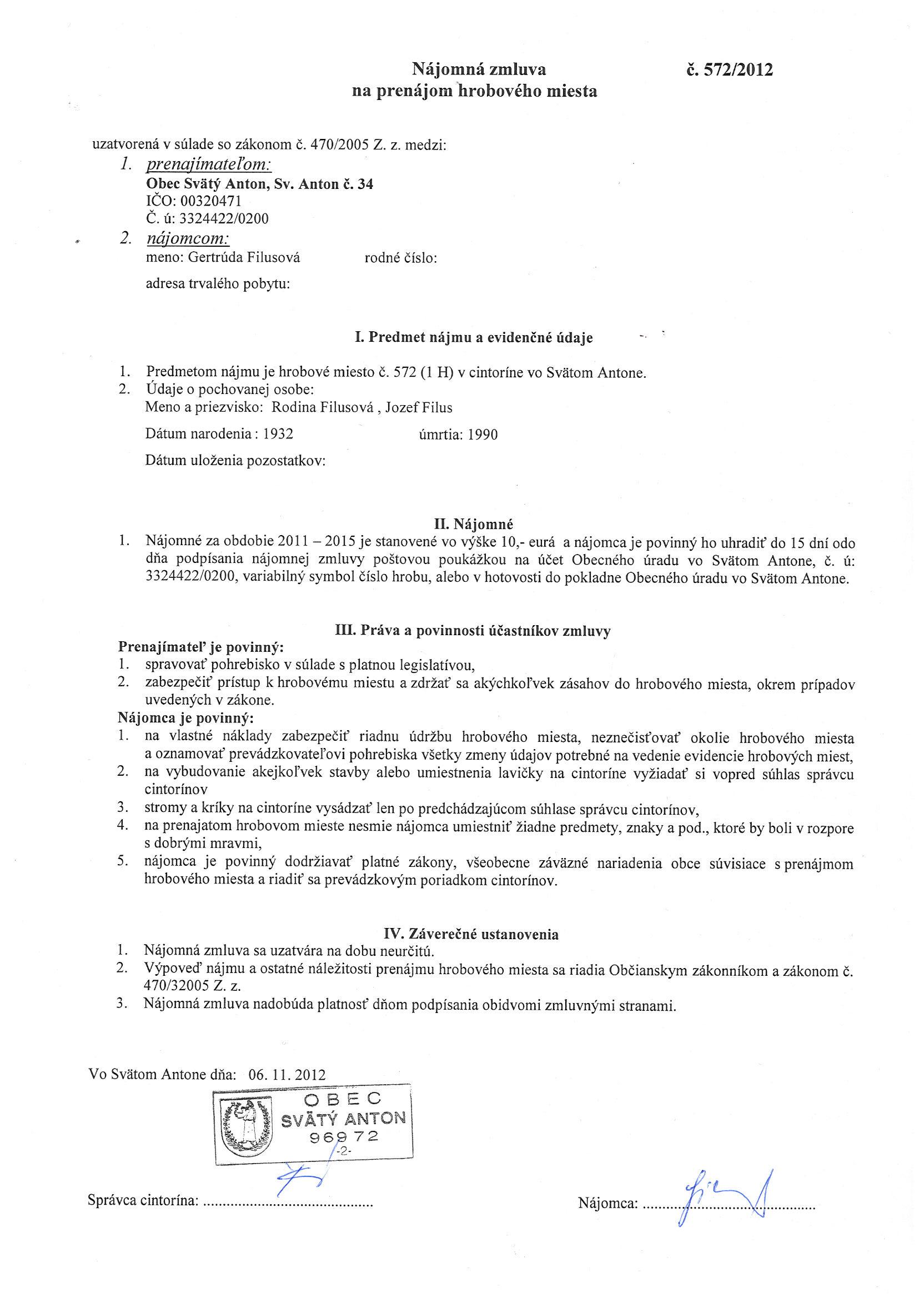 572/2012, Gertrúda Filusová, Prenájom hrobového miesta |