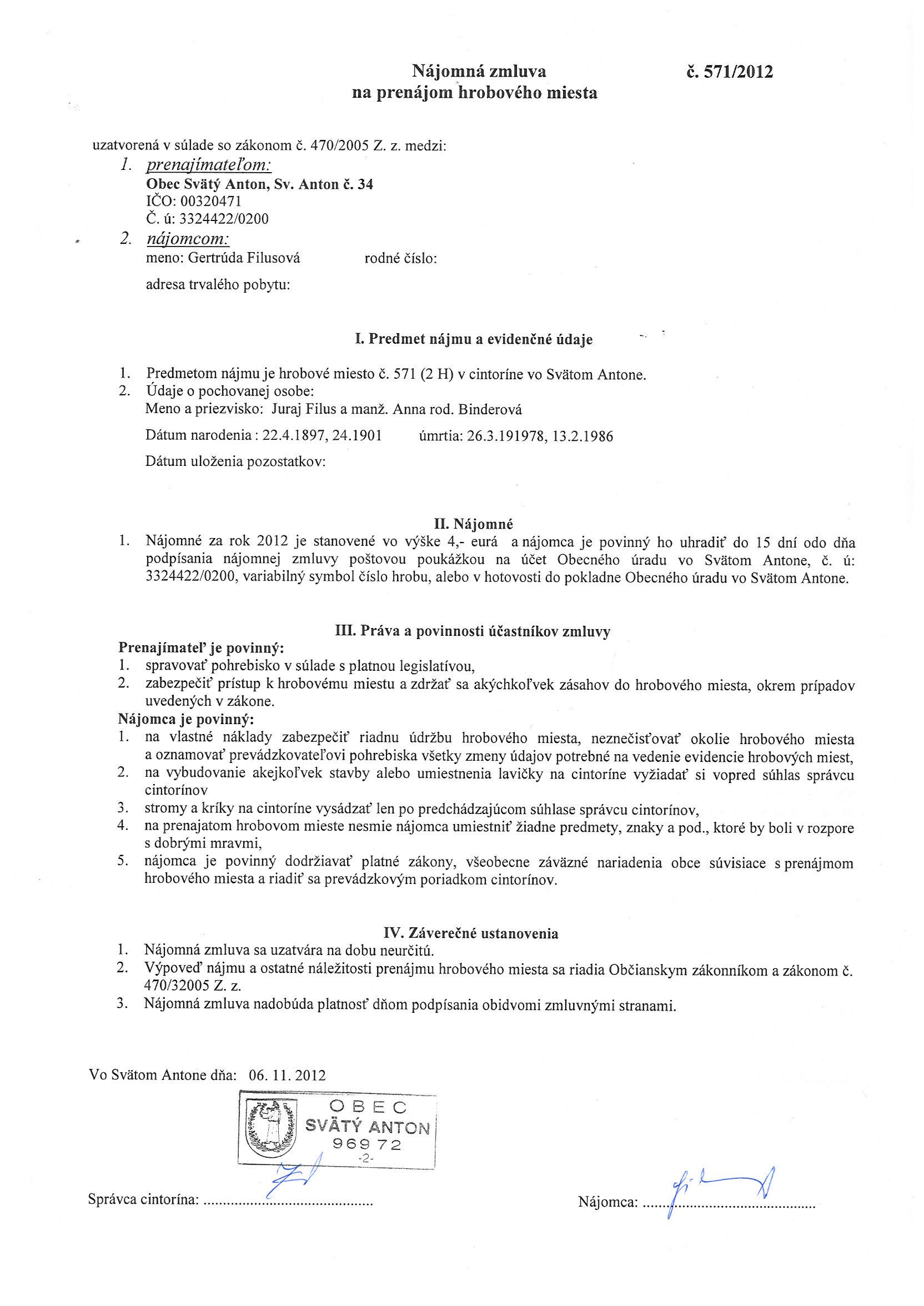 571/2012, Gertrúda Filusová, Prenájom hrobového miesta |