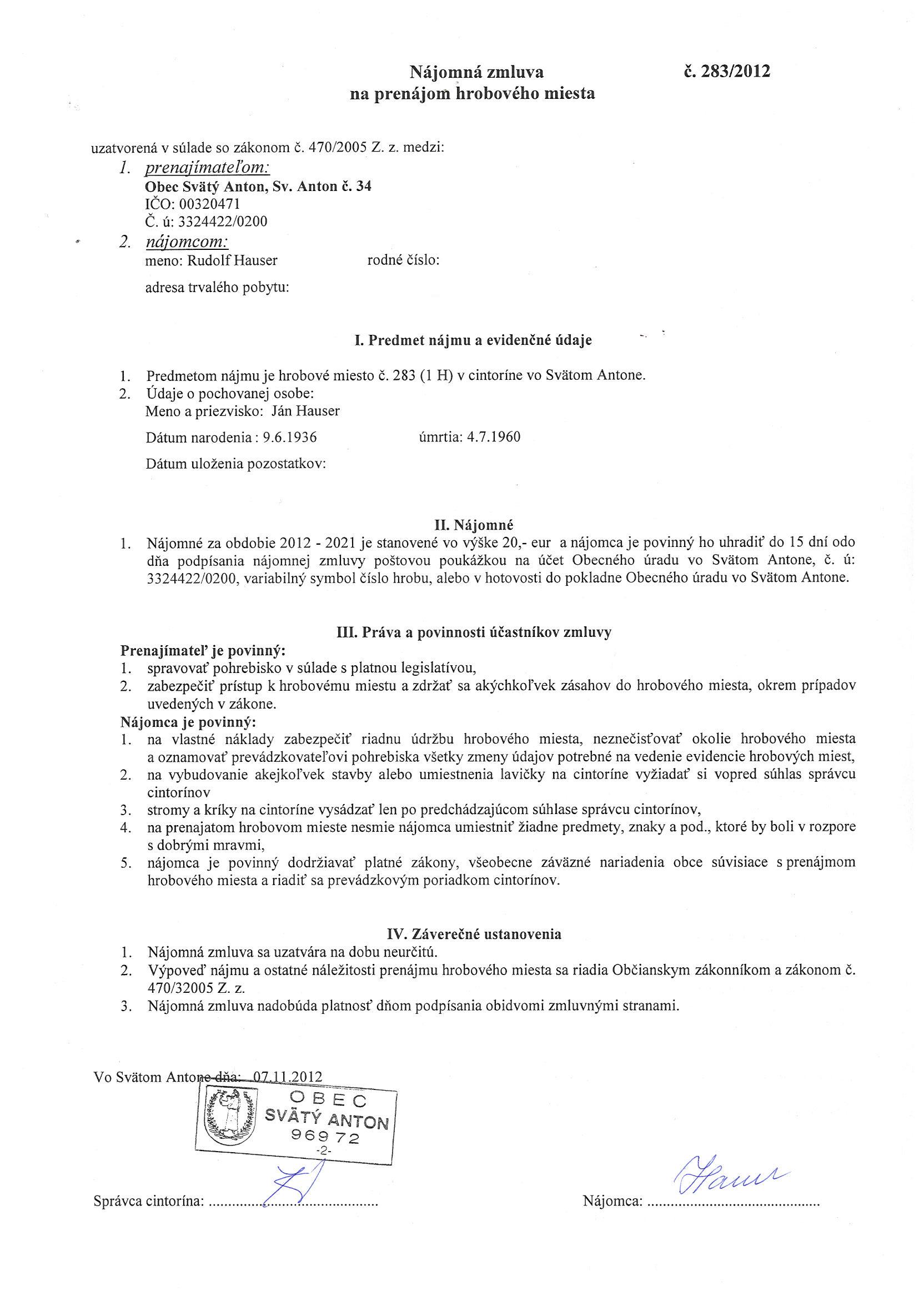 283/2012, Rudolf Hauser, Prenájom hrobového miesta |