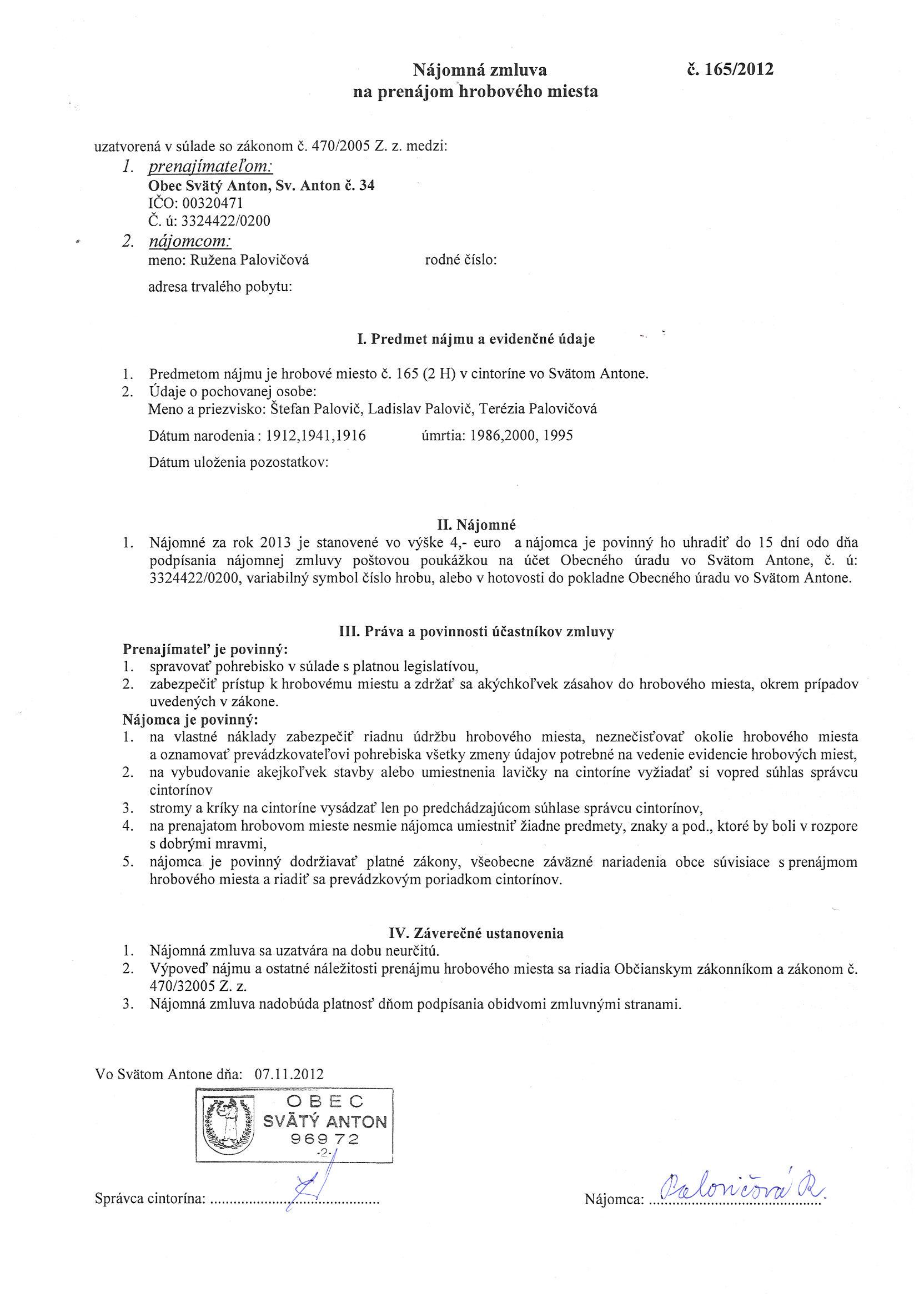 165/2012, Ružena Palovičová, Prenájom hrobového miesta |