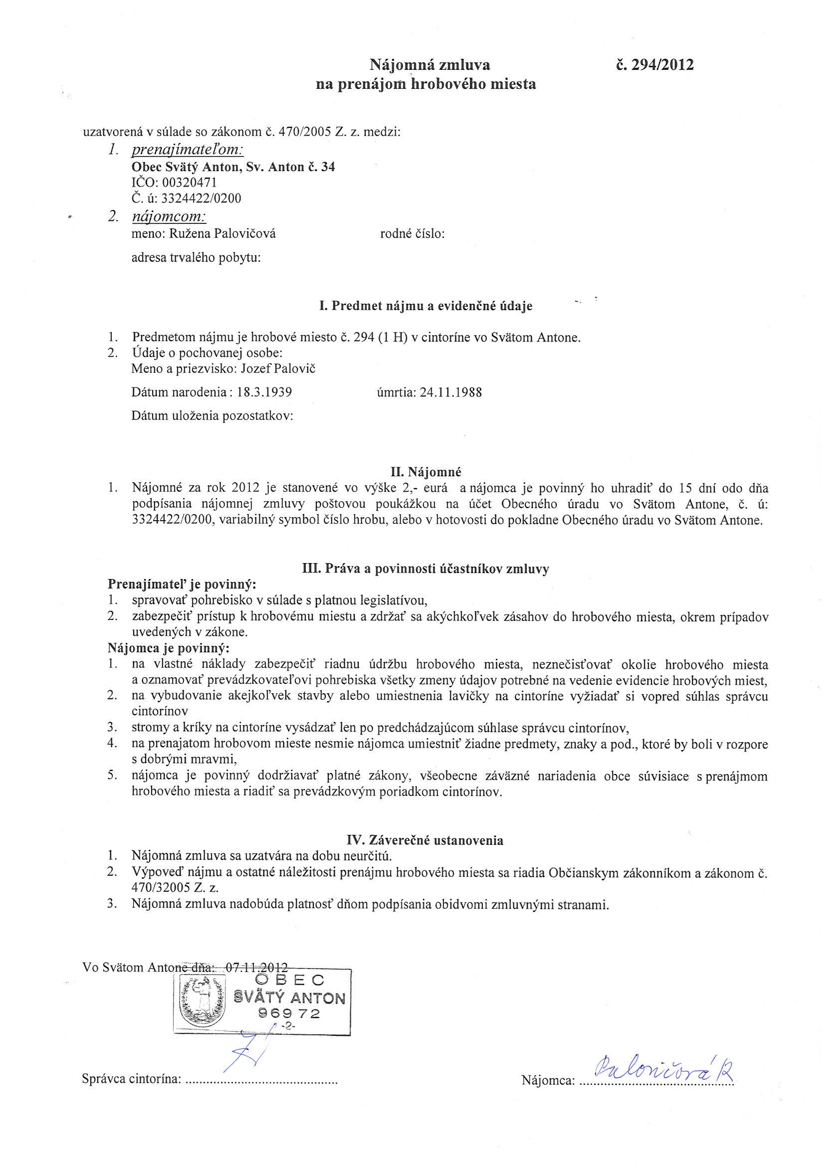 294/2012, Ružena Palovičová, Prenájom hrobového miesta |