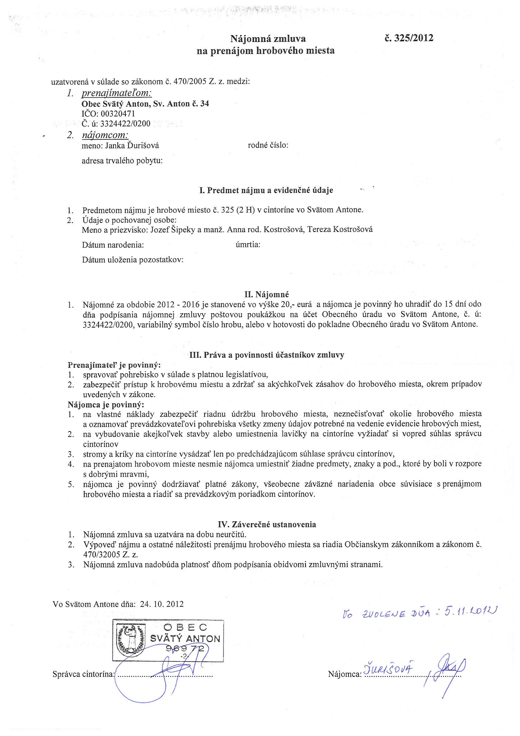 325/2012, Janka Ďurišová, Prenájom hrobového miesta |