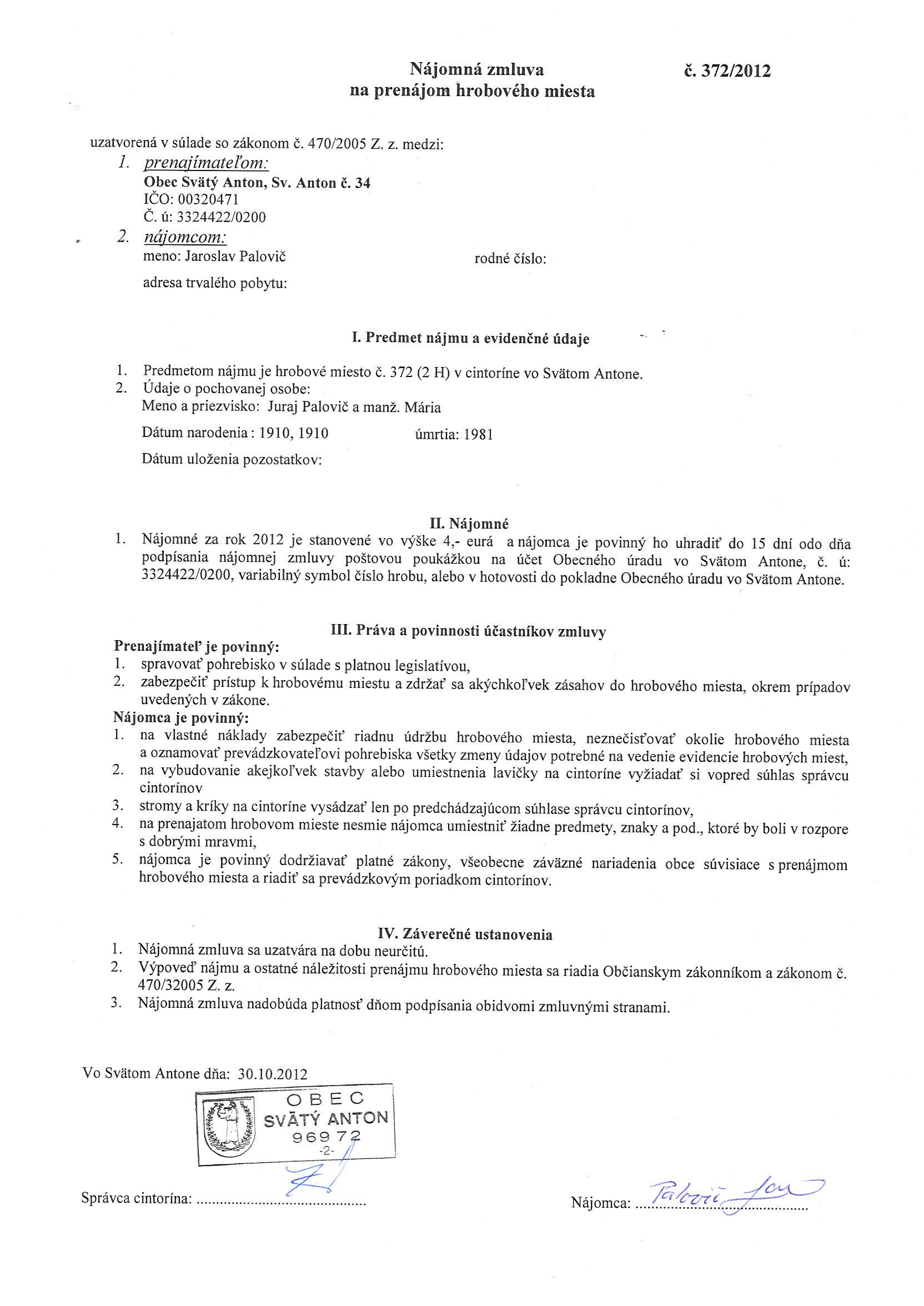 372/2012, Jaroslav Palovič, Prenájom hrobového miesta |