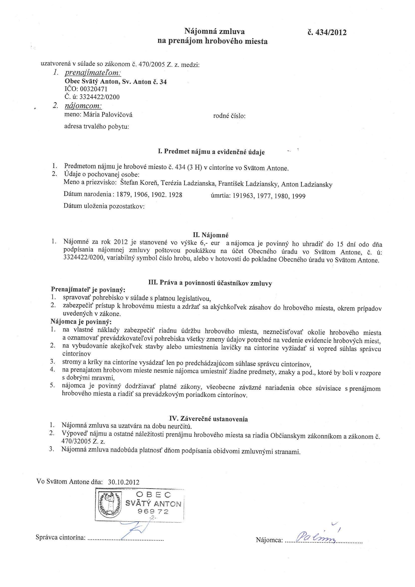 434/2012, Mária Palovičová, Prenájom hrobového miesta |