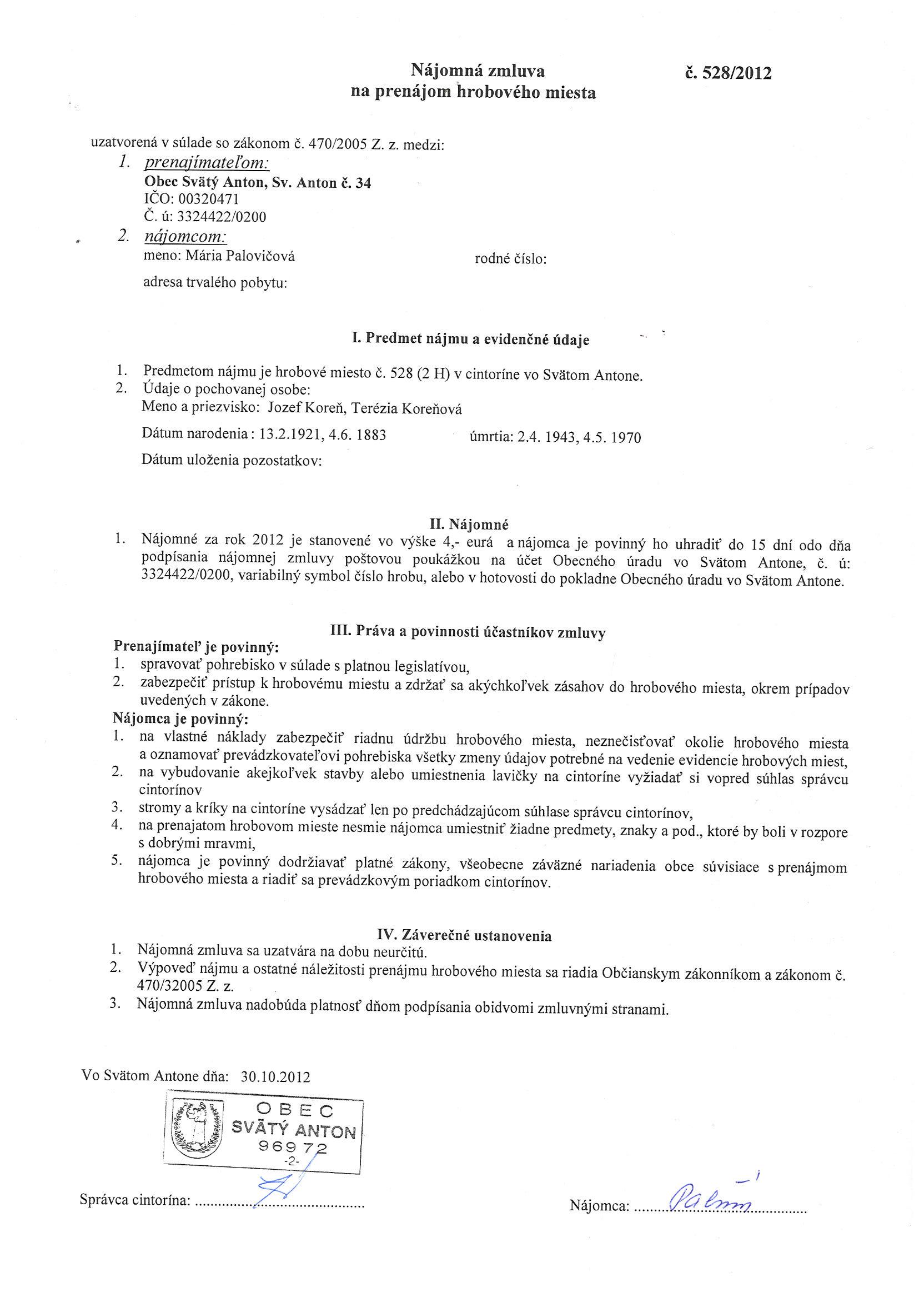 528/2012, Mária Palovičová, Prenájom hrobového miesta |