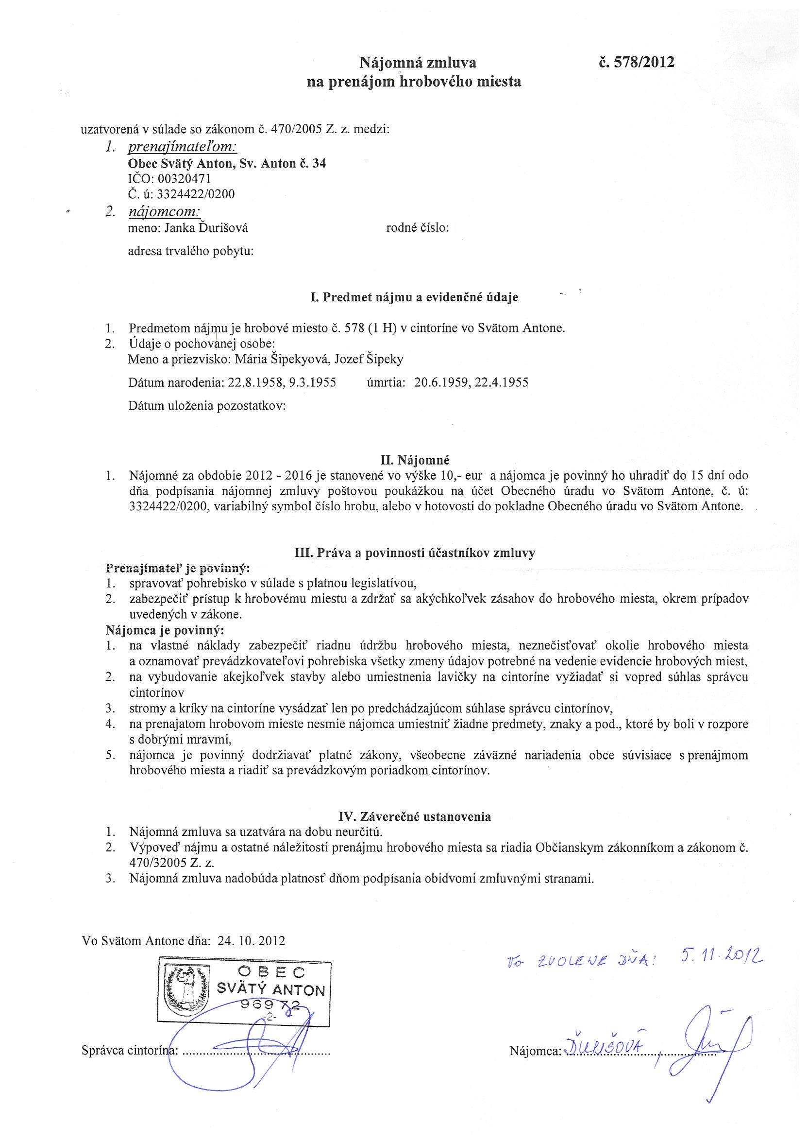 578/2012, Janka Ďurišová, Prenájom hrobového miesta |